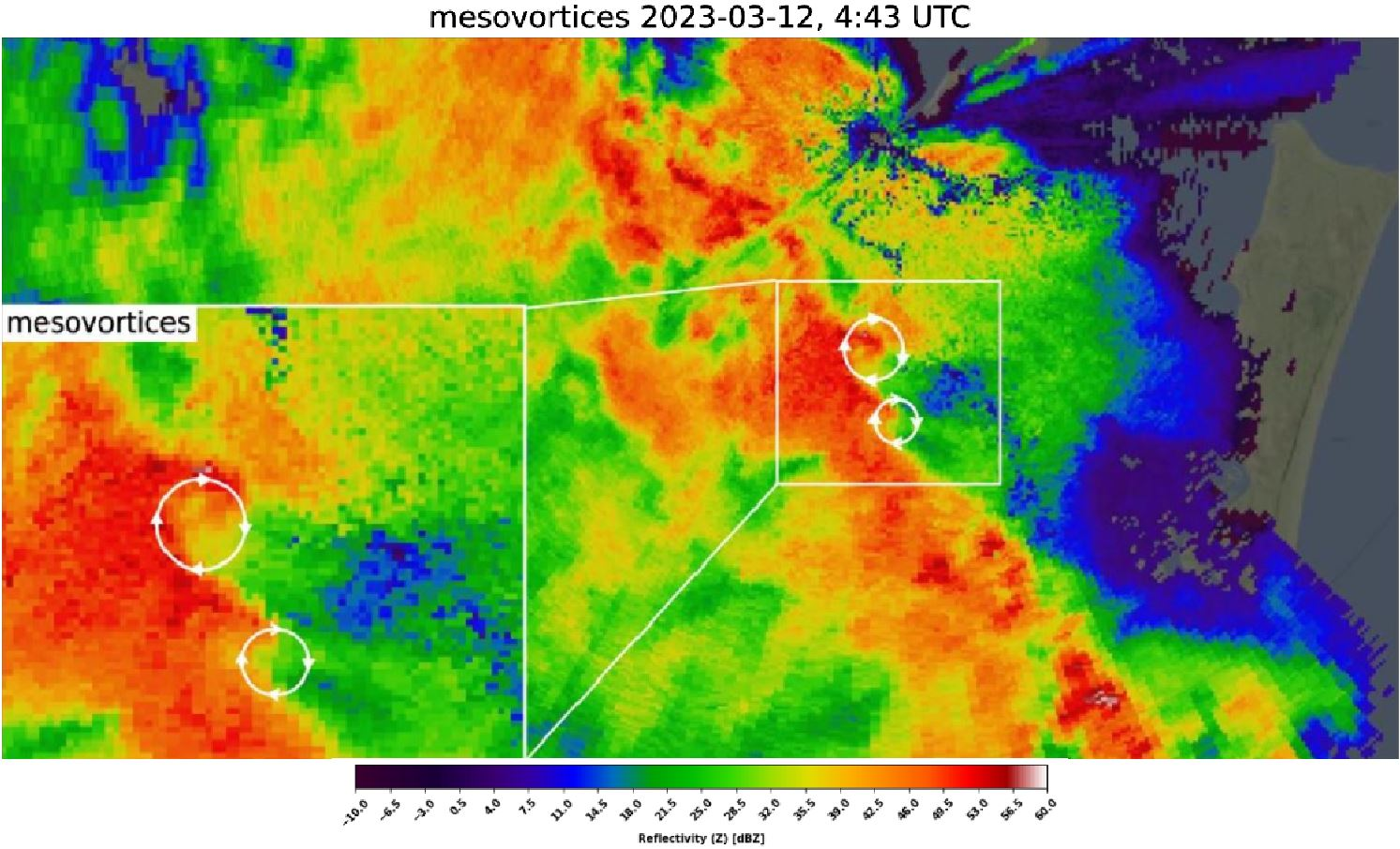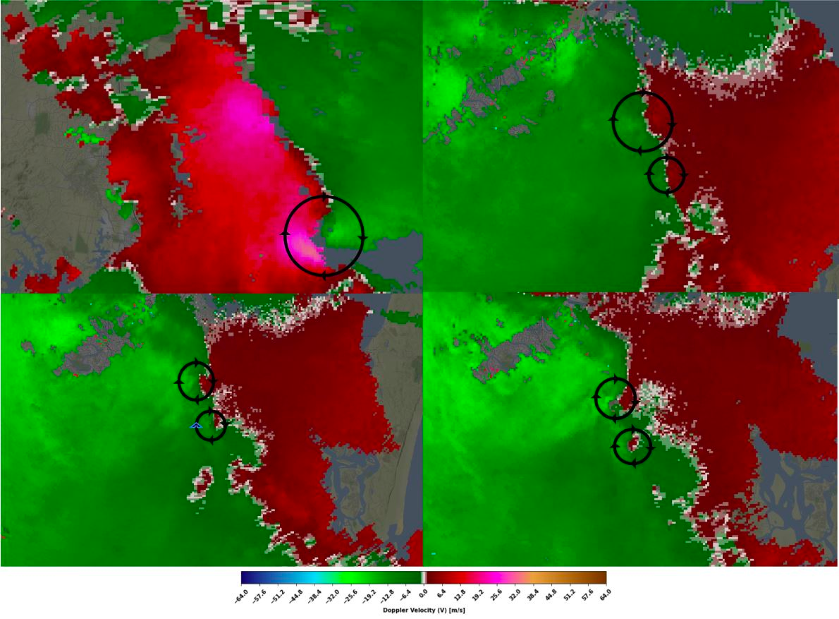 Mesovortices are small-scale, rotating air circulations within larger weather systems, often found along the squall lines. These swirling vortexes are typically a few miles in diameter and can develop rapidly within a storm. Mesovortices can be responsible for the formation of tornadoes.