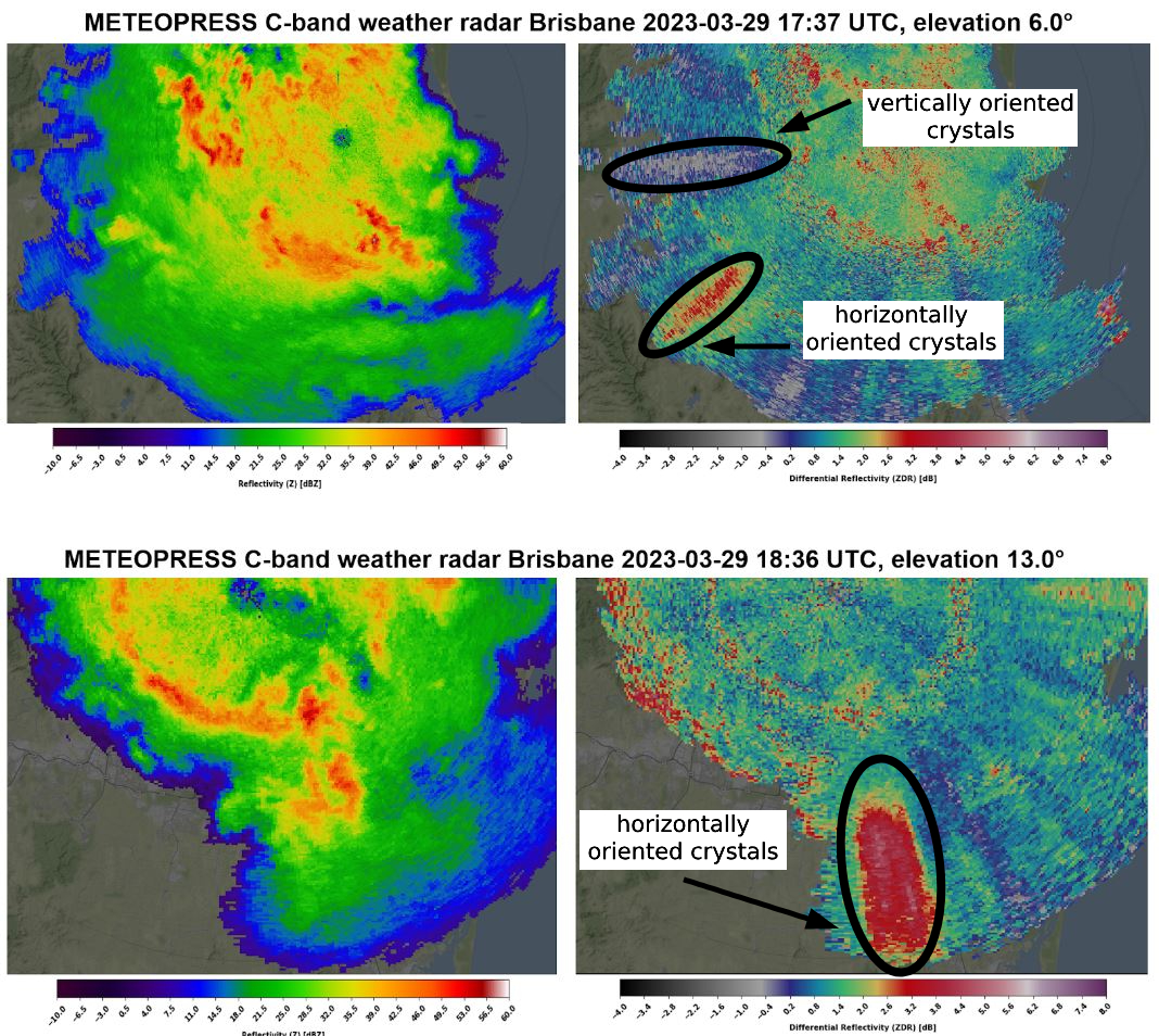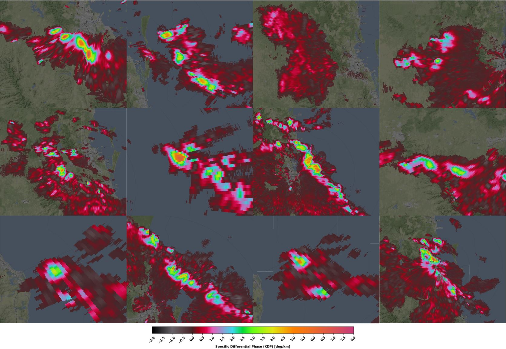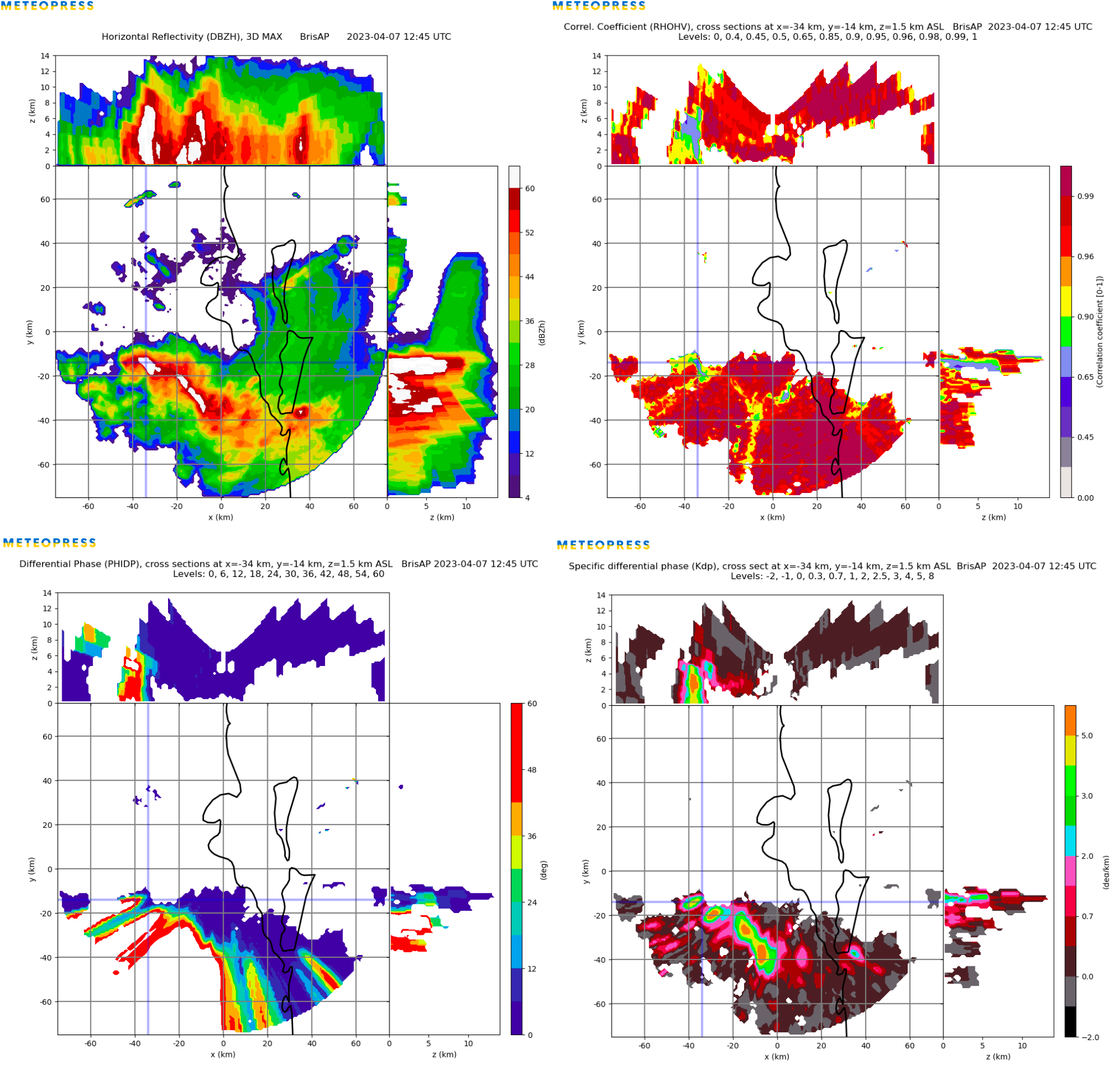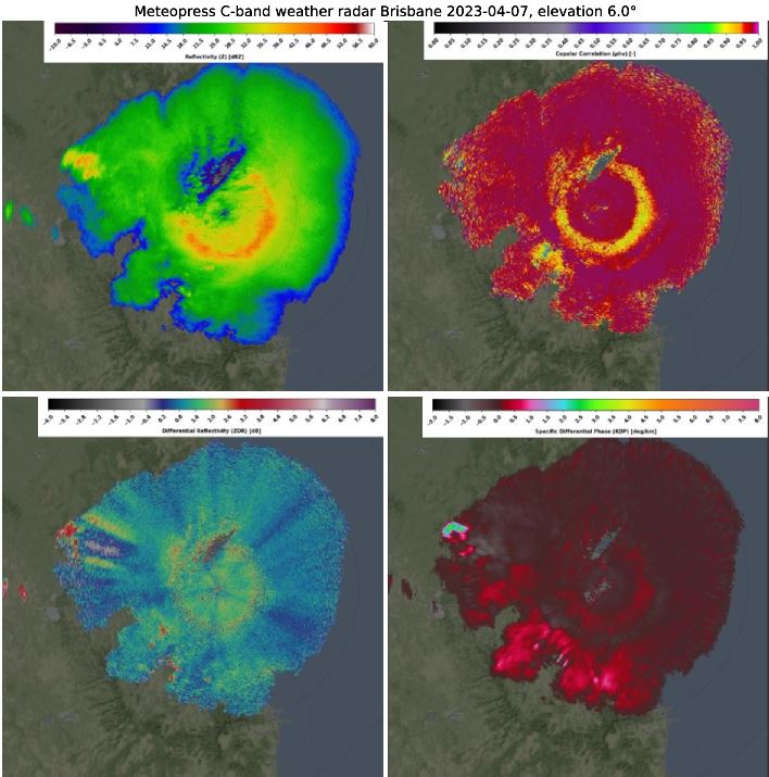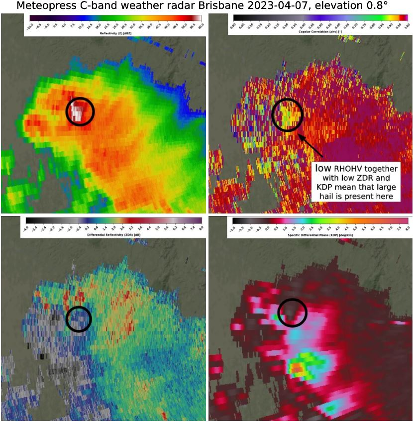 On April 7, 2023, one of the most severe situations occurred with intense thunderstorms. After numerous supercells that occurred near Brisbane, Meteopress weather radar caught the squall line that was accompanied by downbursts and hail. High values of KDP (specific differential phase) suggest the presence of downbursts in regions with heavy torrential rain. Large values of differential phase suggest the attenuation of radar signal in heavy precipitation. In the northern part of the squall line, the supercell formed with hail, and the column of radar reflectivity above 60 dBZ reached 8 kilometers in height. Then the squall line with the supercell continued over the sea.