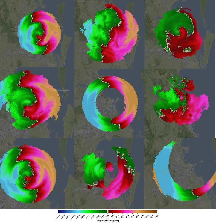 Doppler velocity data at higher elevation allow us to see how the direction and speed of wind is changing with altitude. This often creates beautiful red and green pictures just as seen in the picture below. Because radar is transmitting at a higher angle, areas farther from the radar site are in reality higher than places close to a radar and differences in wind directions are more common than in the CAPPI visualizations (values at fixed altitude). Here, the wind blows from the east at lower altitudes but changes its direction to NNW at higher altitudes.