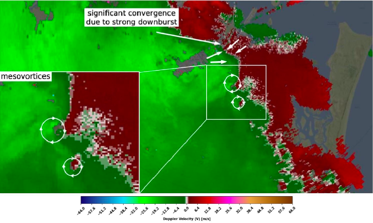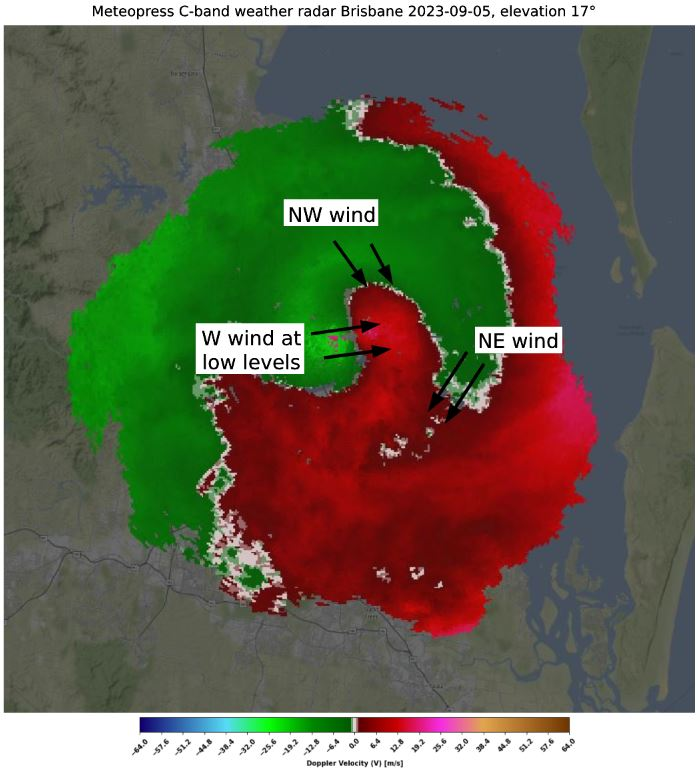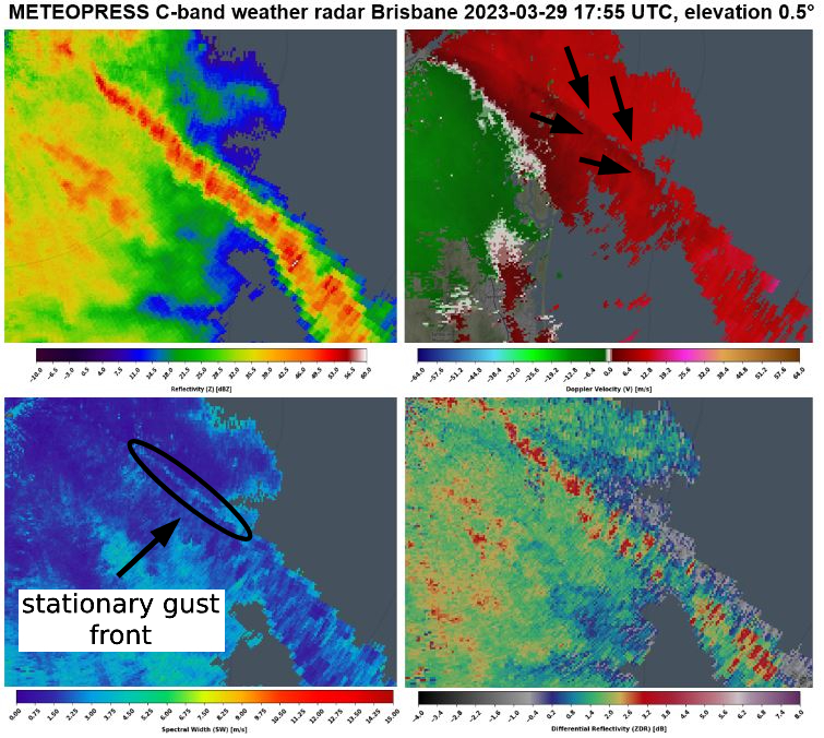 On March 12, 2023 the storms near Brisbane were organized into a squall line that was accompanied by heavy rain and downbursts. During the squall line development, radar detected a lot of regions with potential downbursts. Along the squall line, there was strong convergence; therefore, some low-level mesovortices started to develop, mainly near the downbursts because downbursts can accelerate the line of storms near the regions where they occurred. Low-level mesovortices were mostly weak, but one of them was stronger with a significant region of weak radar reflectivity in the inflow region. The region with significant convergence was visible in spectrum width as a narrow line of high values. Narrow line is waved, which indicates the development of mesovortices.
