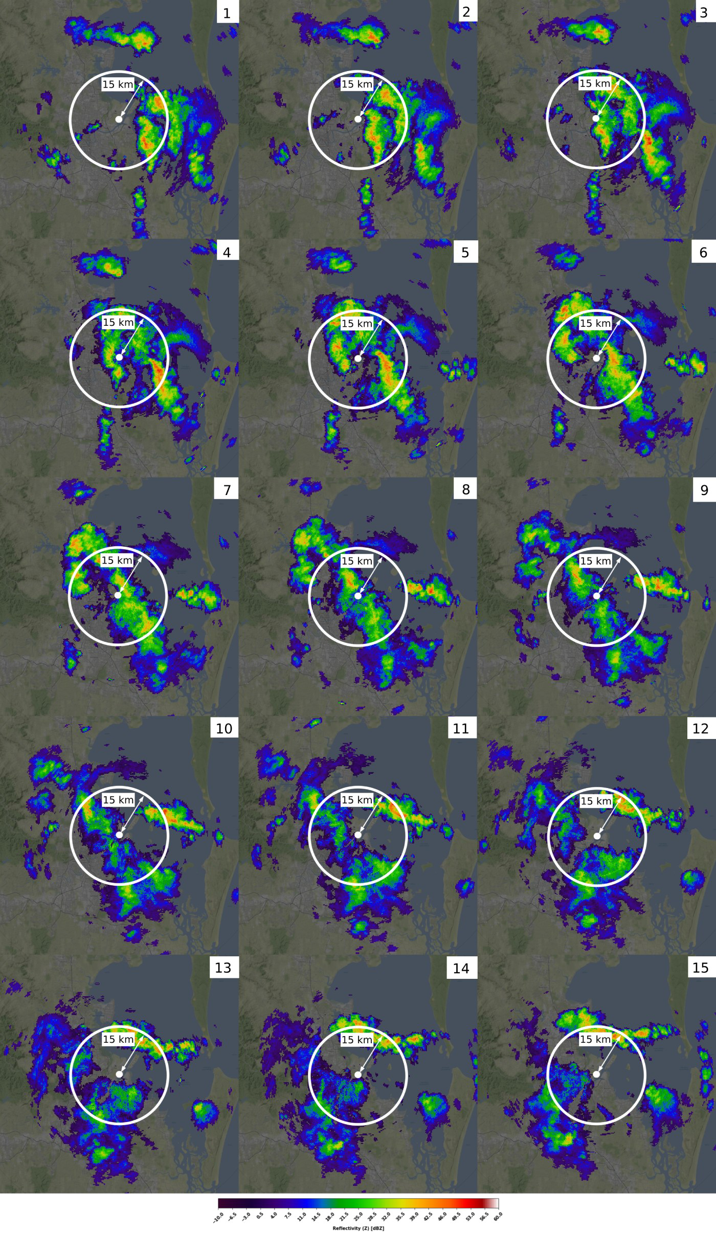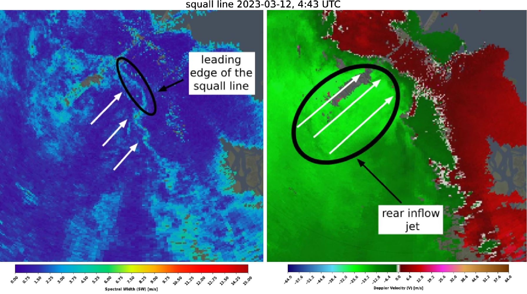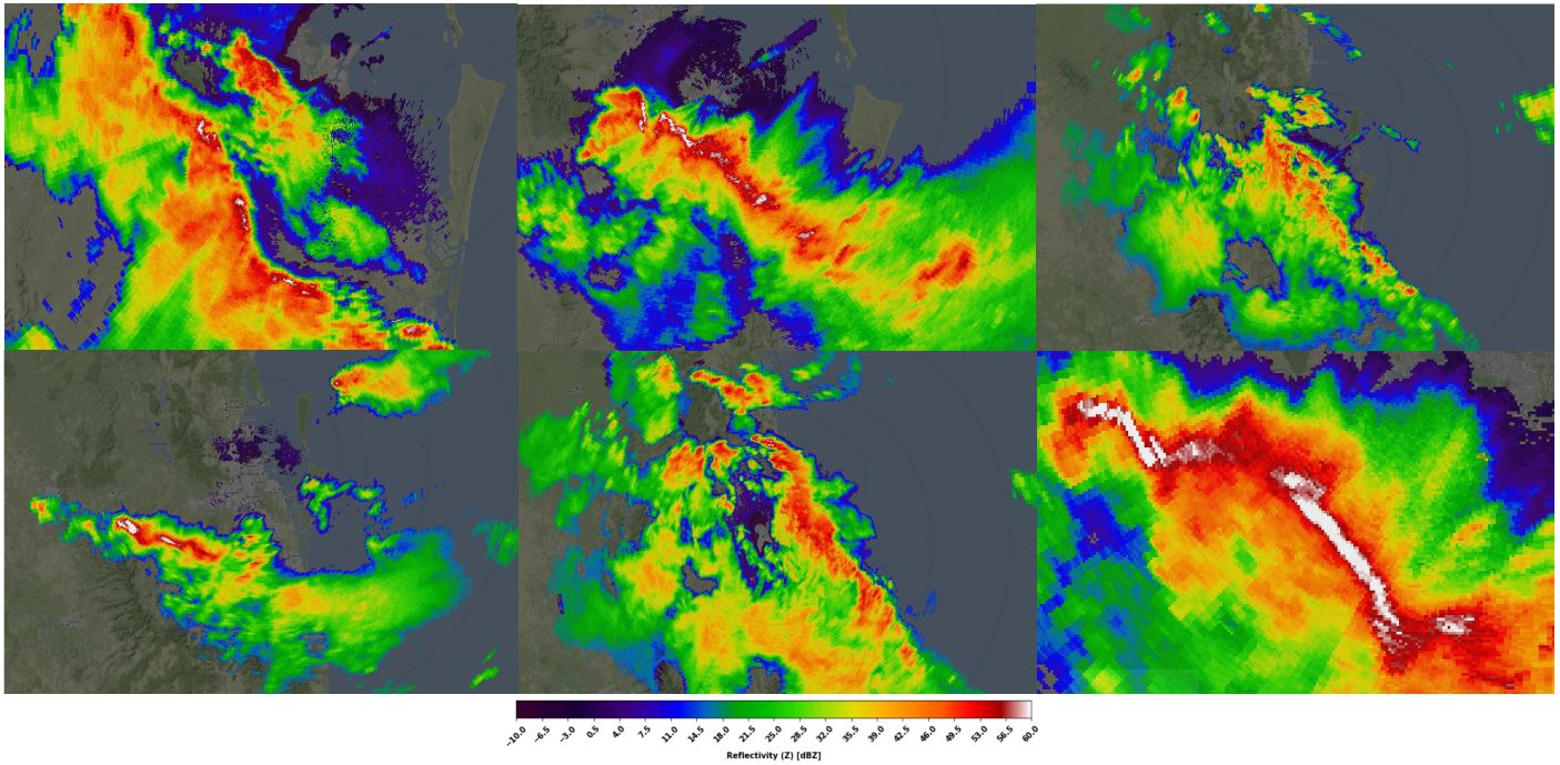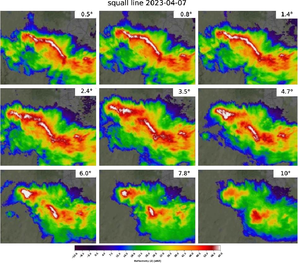 Squall lines are narrow, elongated bands of intense thunderstorms that form along or ahead of a cold front or in other weather-related scenarios. These meteorological phenomena are characterized by a linear arrangement of thunderstorms that can extend for hundreds of miles. Squall lines typically feature severe weather elements such as strong winds, heavy rainfall, hail, lightning, and sometimes tornadoes. In radar data, squall lines are well visible in basically all products as a line with different values. In doppler velocity, strong convergence is visible.