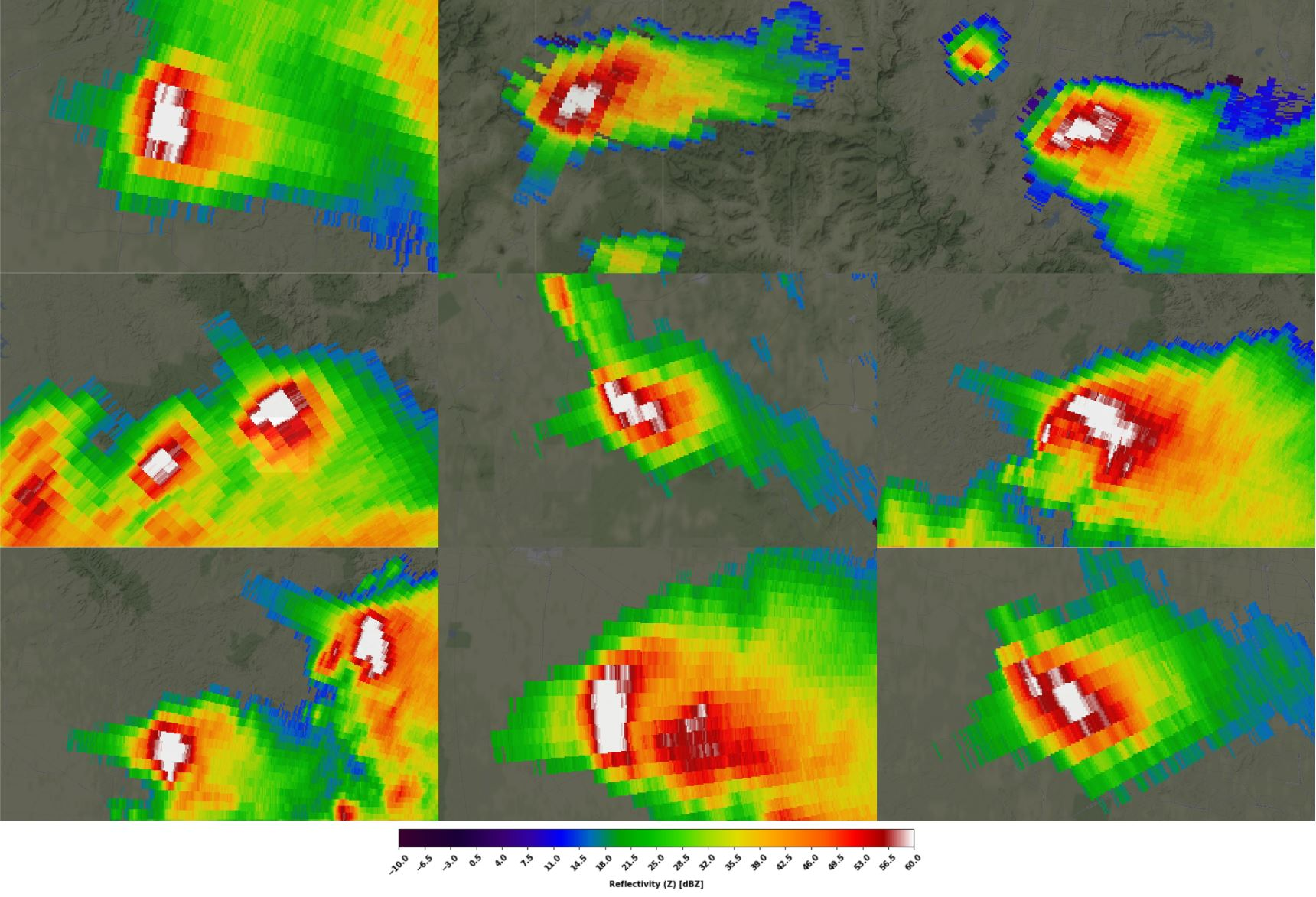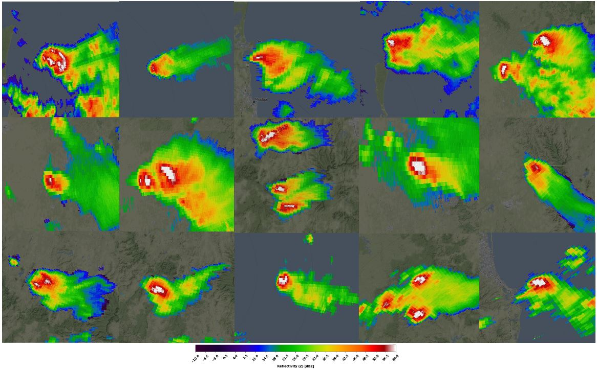 Supercells are strong storms with rotating updraft (mesocyclone). These storms are often accompanied by big hail, strong winds and sometimes even tornadoes. Supercells tend to have specific characteristics on radar products. Rotation can be visible in doppler velocity data, where significant differences in radial speeds are present. Big hail is characterized by lower ZDR and correlation coefficient values in radar images. Strong and big tornadoes can also be seen at doppler velocity data and it would be similar to the supercells, although differences in speed would be much higher and its area smaller. Also debris can be seen as areas of very low RHOHV.