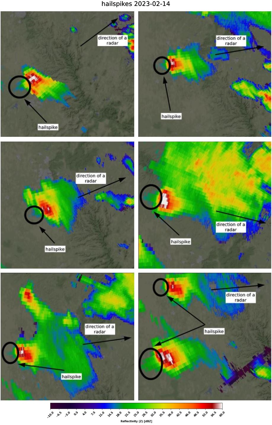 When a storm contains big hail, desired artifacts behind the storm in a direction from the radar can occur if the diameter of hailstones is close to the wavelength of a signal from the radar due to Mie scattering. Wave then partially bounces from hailstones to the ground, back to the cloud and to the radar again. Radar then thinks that there are targets behind the storm, because the signal arrived later. Hail spikes are often filtered, but are important for identifying large hail.