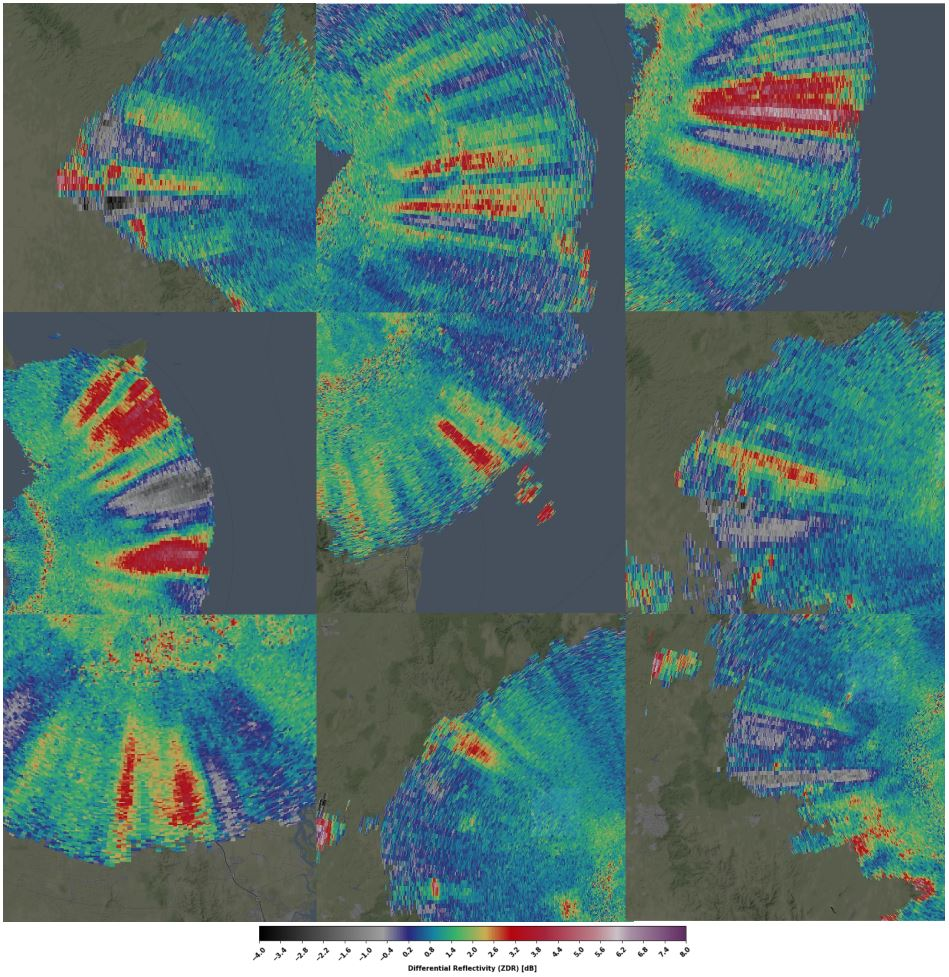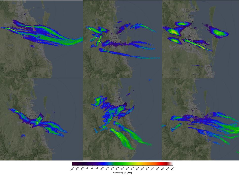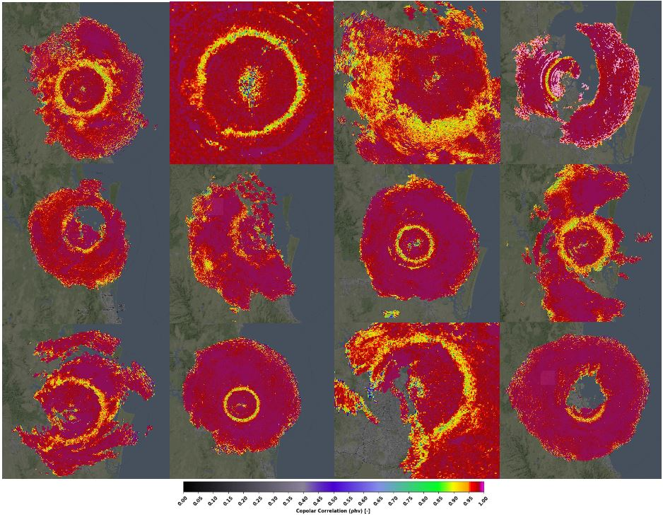 Other forms of clutter include biological targets - birds and insects - are visible in Brisbane almost every day, mostly between sunset and sunrise. They have low to medium values of reflectivity, very high ZDR and low RHOHV due to their shape. Doppler velocity tends to correspond with wind direction.