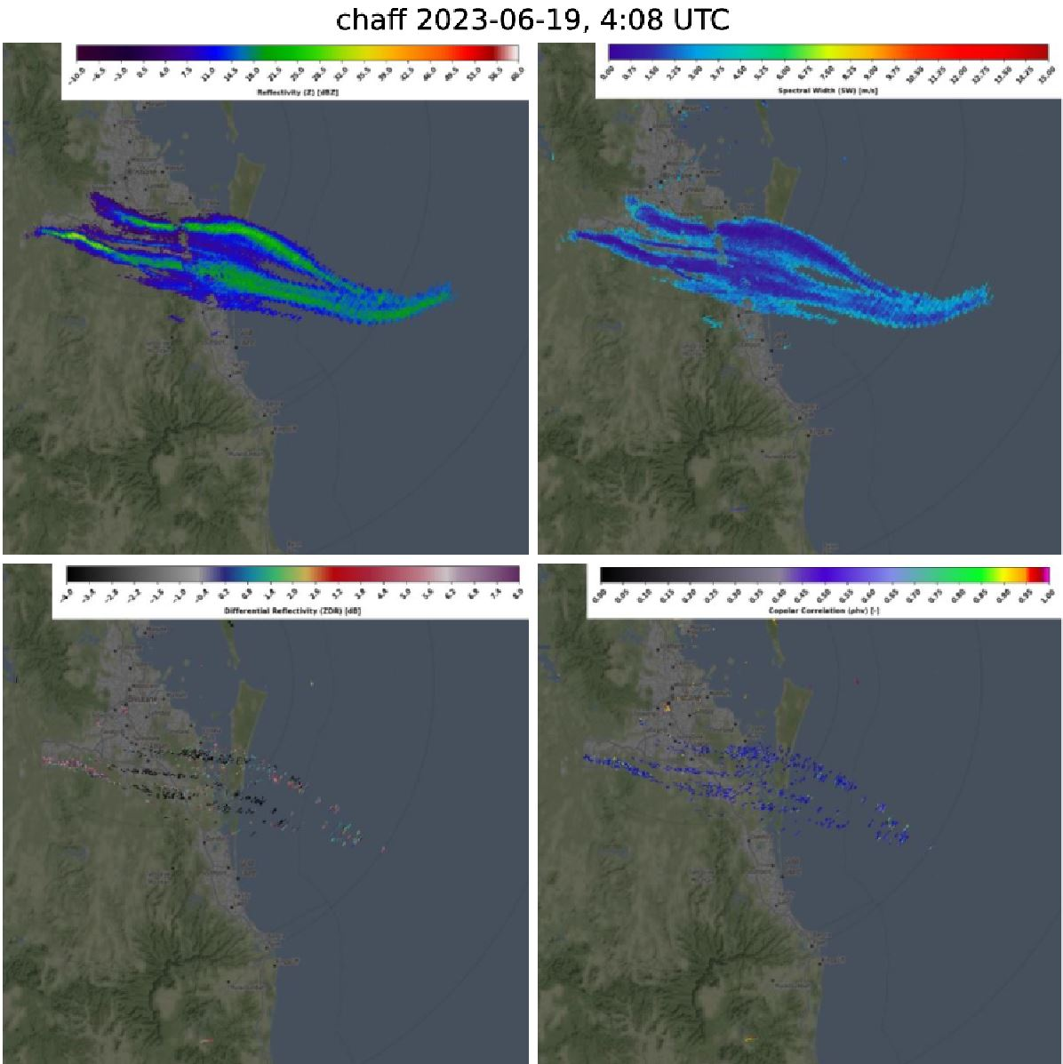 Chaff is used by the military to blind the radar by dispersing highly reflective particles (usually aluminum foil fragments) in the air. And by looking at the pictures below, it works! Reflectivity is low to medium, ZDR is very noisy and RhoHV very low. Doppler velocity corresponds to the wind direction. In Brisbane Airport radar area, the chaff can be seen pretty often.