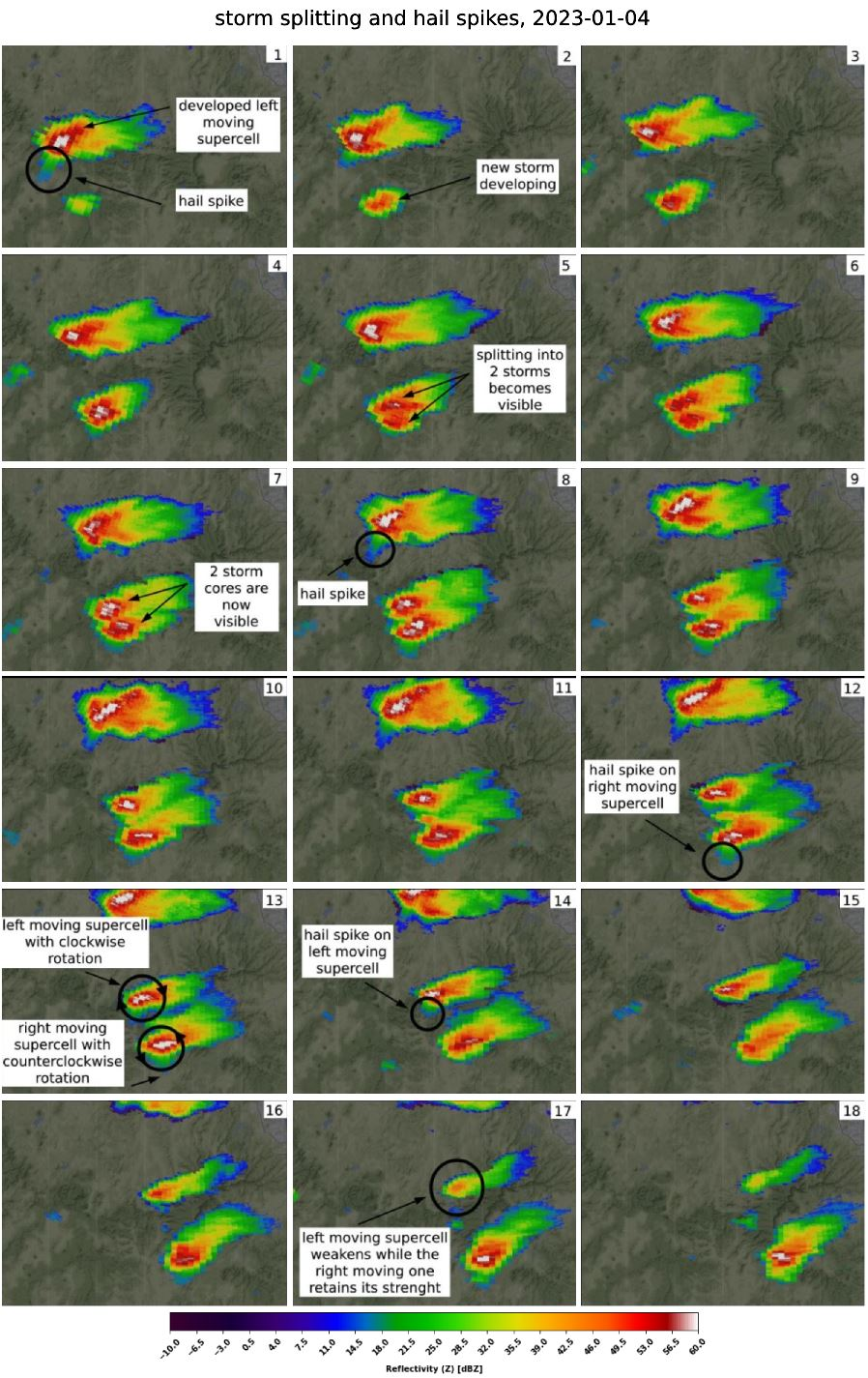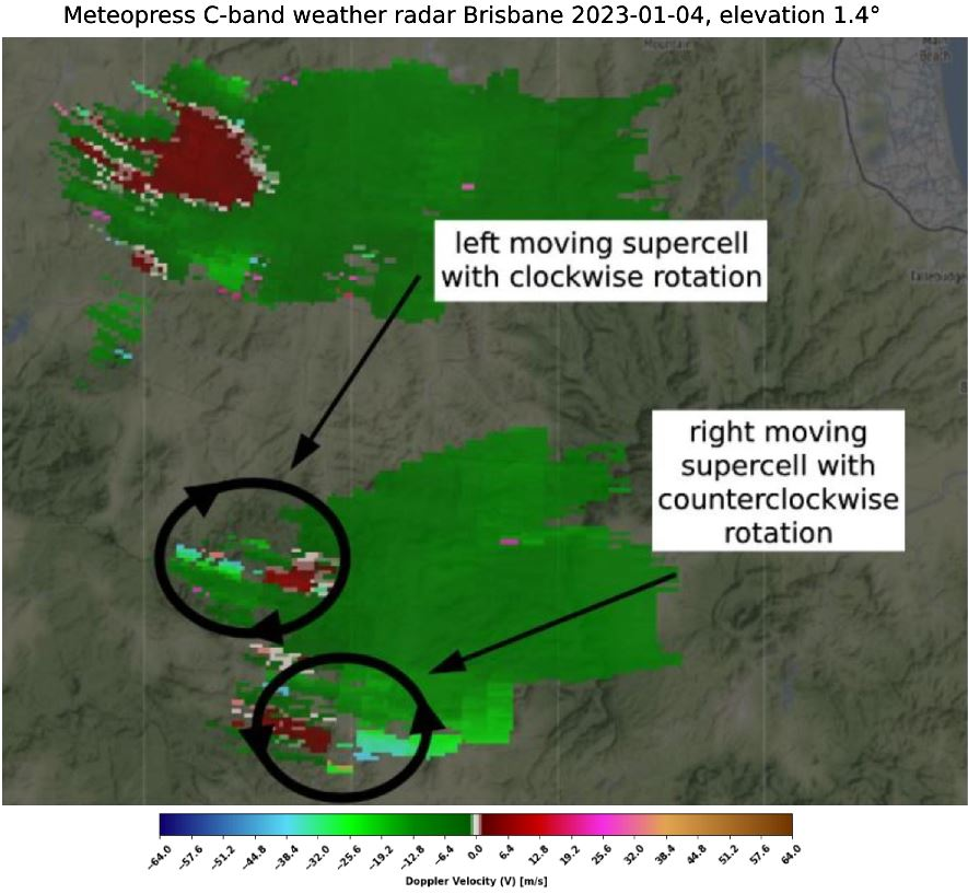 Supercells need strong vertical wind shear to form. Sometimes, when wind shear is high, but the direction of wind does not change or changes little with height, supercells can split into 2 storms. One moving left with clockwise rotation, the other one moving to the right with counterclockwise rotation. In the northern hemisphere, the left moving supercell is usually a bit weaker and has a longer duration. In the southern hemisphere it is opposite. In the case below, splitting occurs only 30 minutes after the storm began to form. Left moving supercell then continues to the northeast, the right moving one to the east. Left moving storm starts to weaken earlier in this case, while the other one retains its strength. From doppler velocity data, we can see 2 different mesocyclones, each one of them spinning in a different direction.
