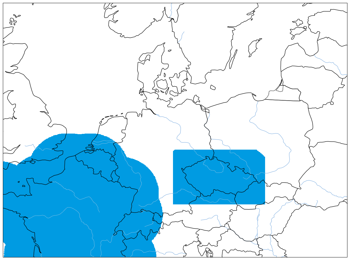 Radar reflectivity data spans the last hour in 10-minute intervals. Its spatial resolution, eight times the resolution of GFS, is downscaled using a convolutional encoder. Unfortunately, this experiment's radar dataset only contains sufficiently reliable data for the area of France and the Czech Republic, making it necessary to inform the model about these local limitations in the metadata. Training loss is weighted toward radar-covered areas to motivate the use of radar for predicting APCP, and evaluation is performed solely for these areas.