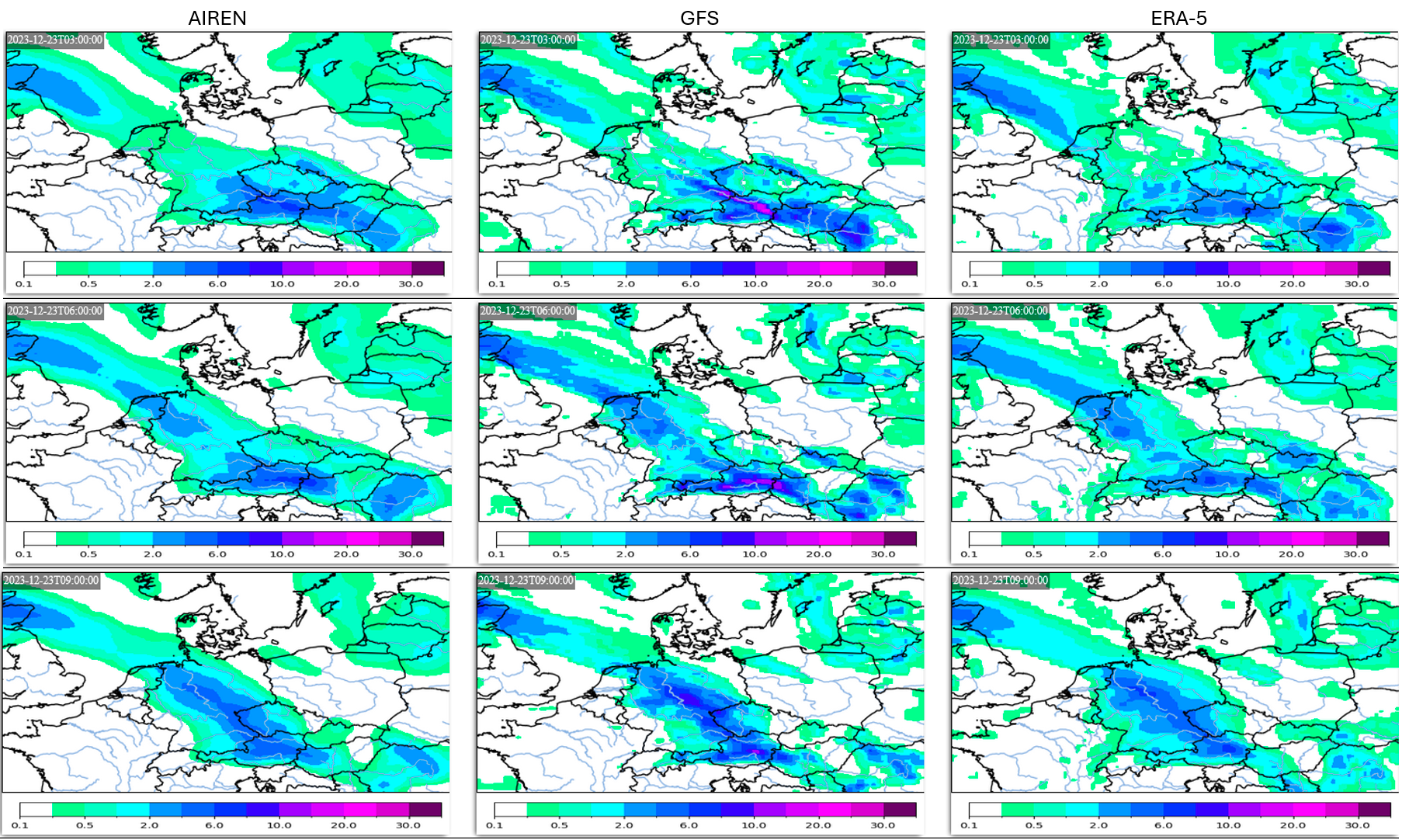 On 23rd December 2023, a waving cold front was over Central Europe, and precipitation was moving from the west at this boundary. Analyzing the 3-h aggregated AIREN-NWP forecasts, the peak precipitation amounts of the GFS model are correctly adjusted.