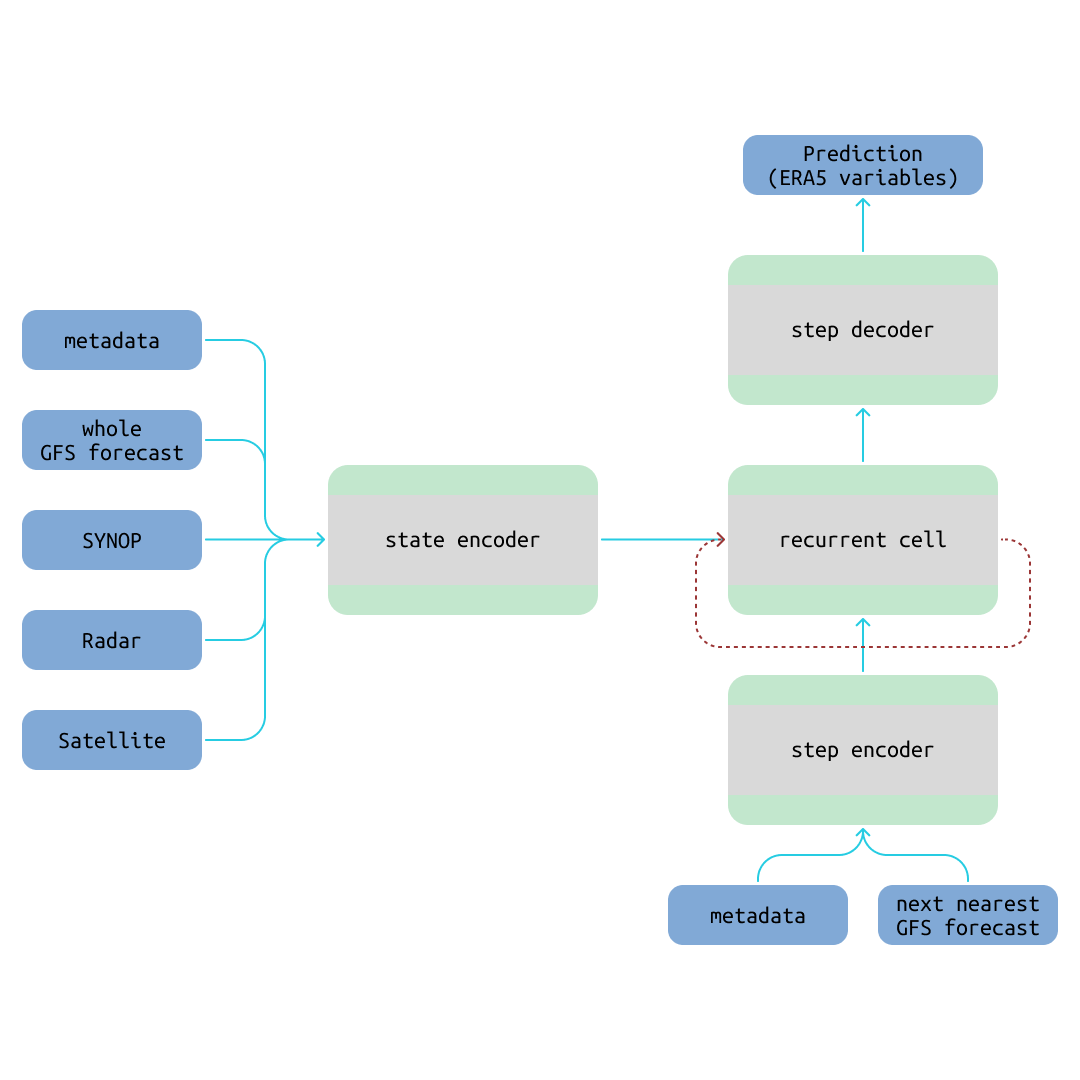 As the starting point, AIREN-NWP utilizes Global Forecast System (GFS) forecasts for the Central Europe area. These forecasts are issued four times daily at six-hour intervals, with a 0.25-degree spatial and 3-hour temporal resolution. ERA5 reanalysis serves as the ground truth, matching the spatial resolution but providing hourly data. To achieve this 1-h output resolution, for each recurrent step, we combine the next nearest 3-hour GFS forecast with metadata reflecting how far into the future the current prediction is. We currently focus on three target variables and predict them separately - accumulated precipitation (APCP), temperature 2 meters above the surface (TMP), and velocity of wind gusts (GUST).
