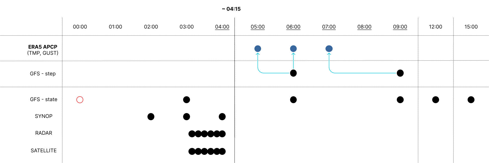 We have decided on this data selection based on extensive experimentation (detailed in the following section). Each of the three variables is predicted separately, allowing for different configurations and straightforward inclusion of other predicted outputs in the future. Notably, APCP is forecasted for 3 hours into the future, while TMP and GUST forecasts reach 6 hours. This tailored approach leverages the strengths of each available data source to optimize prediction accuracy for different weather variables.
