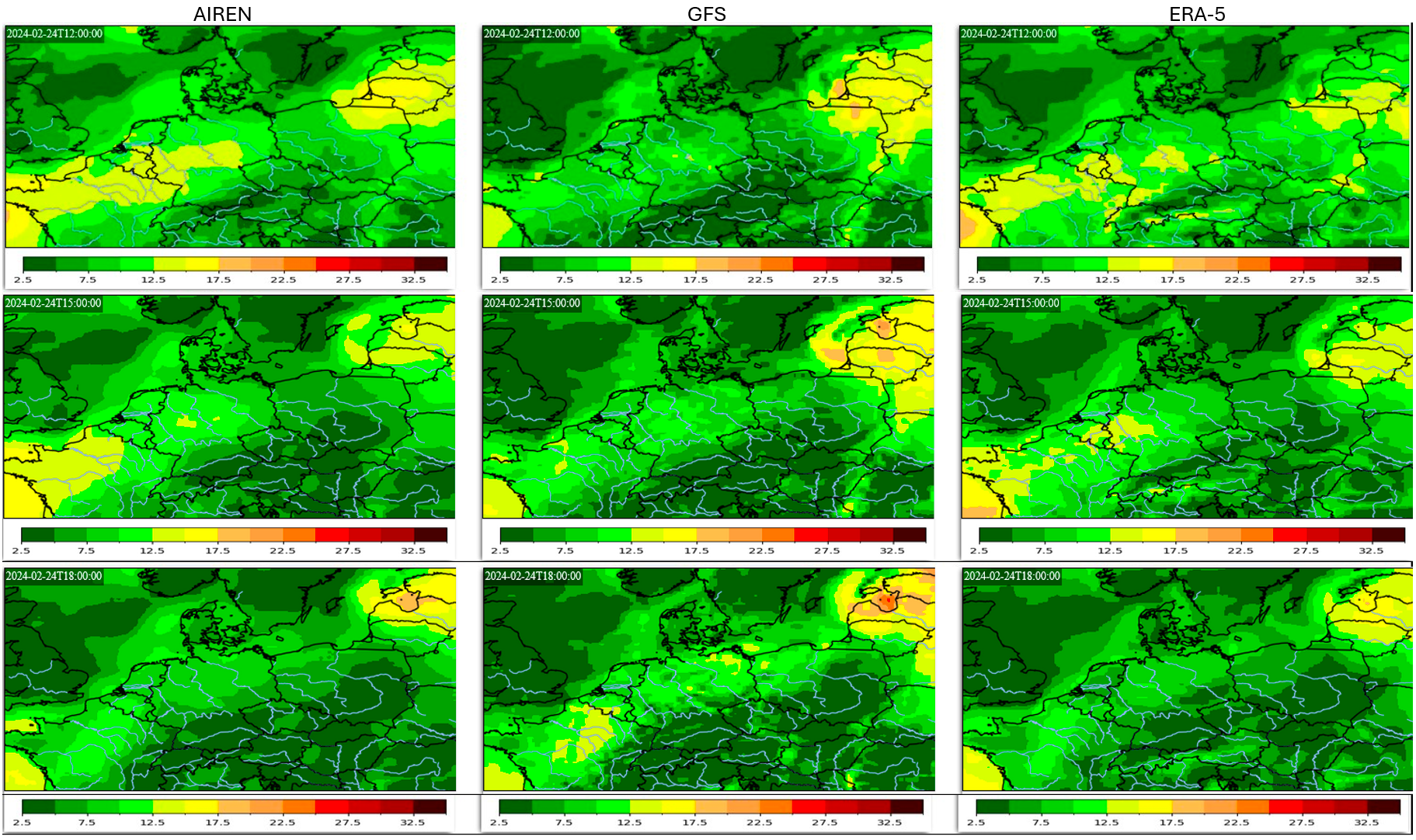 A typical calm spring weather prevailing over Central Europe on 24th February is one of those situations when accurate forecasts are very important, for example, in the energy sector. The AIREN-NWP model better estimated the higher wind speed in France and correctly reduced the speed in the Baltic region and north-eastern Poland at 12 UTC. The input GFS model predicted almost no wind in Central Europe, while AIREN-NWP increased the speeds toward the actual moderate winds present in ERA5. While the situation at 15 UTC is very similar, it has to be noted that AIREN-NWP slightly overshoots the speeds in France. At 18 UTC, AIREN-NWP corrects the wind speeds that are too high in France and the Baltic region while missing the gusts in the Alpine region in the same way as GFS does.