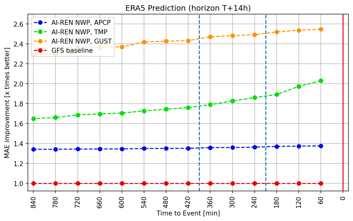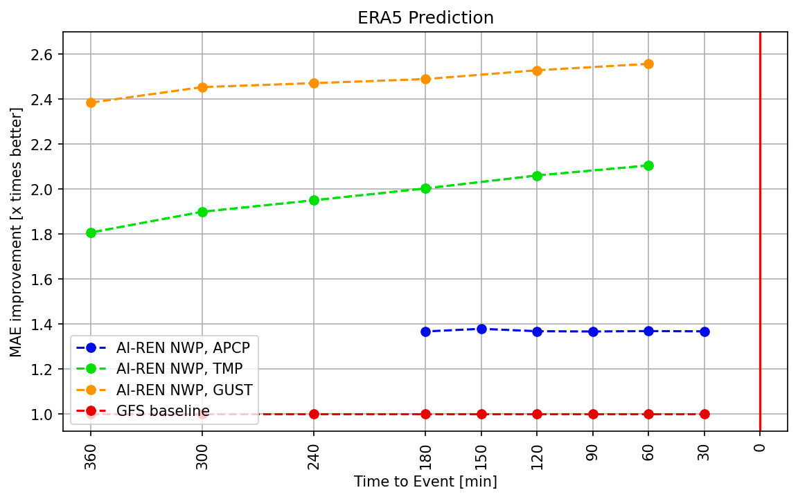 Following the objective of AIREN-NWP to post-process NWP forecasts, we focus on the Relative Improvement of MAE (mean absolute error). This metric indicates by what factor the MAE of AIREN-NWP forecasts is lower than that of a baseline. ERA5 reanalysis is used as the reference for MAE computation of both the examined model and the baseline. The relative improvement should increase towards the event - as the forecast time draws nearer.