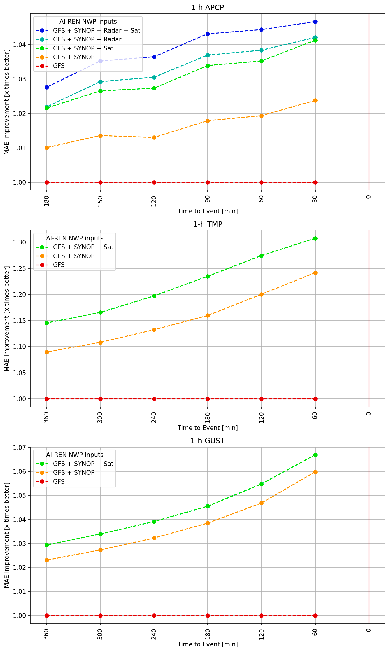 The plots above show a clear correlation between the number of input data sources and the improvement in prediction performance. Moreover, the relative MAE improvements always increase towards the event, as is expected of AIREN-NWP. For the last prediction before the event, the models with all inputs available achieve respectively 4.7%, 30.8%, and 6.7% improvements over our GFS post-processing baseline.