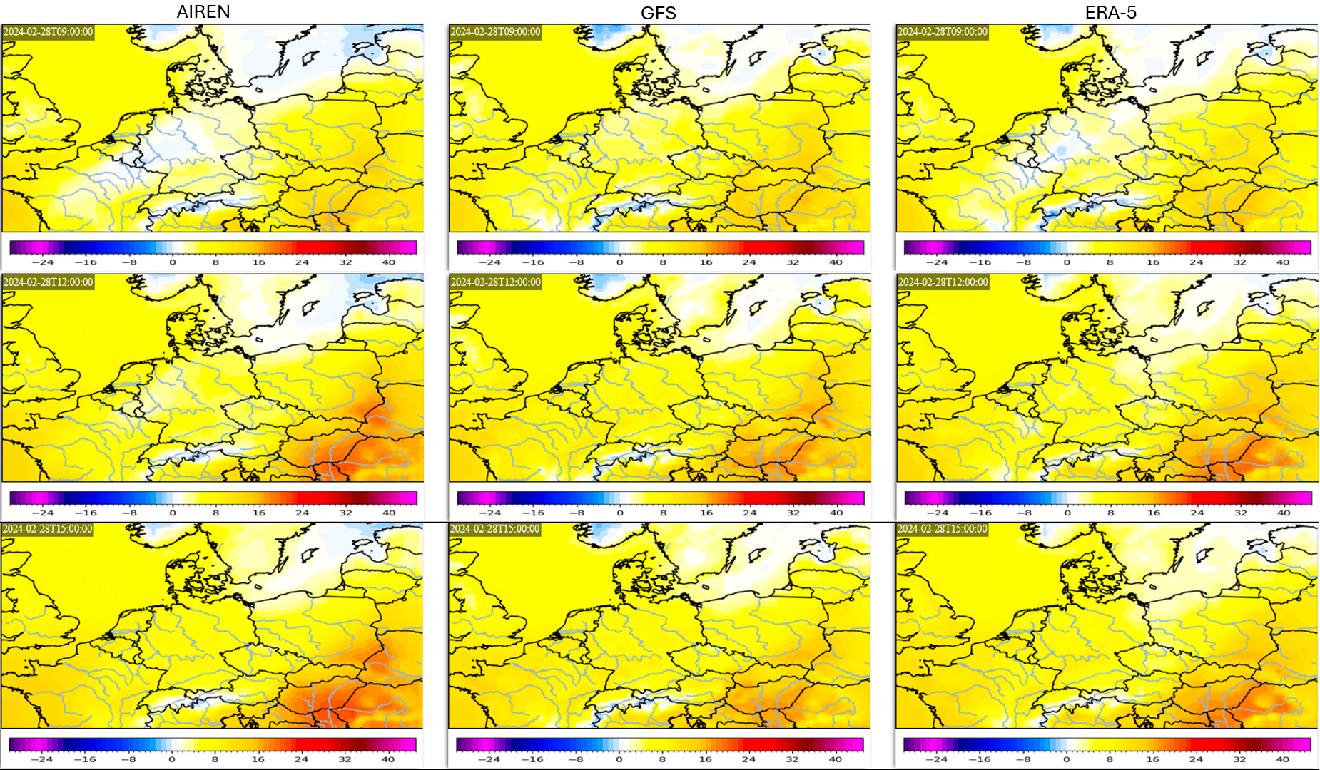The AIREN-NWP forecast is similar to the ERA5 reanalysis, with the only major mistake of predicting higher temperatures in southern Poland at 12 UTC. AIREN-NWP correctly lowered the temperatures of the input GFS forecast in the area over Germany and France and increased temperatures in Hungary, closing the gap to the ERA5.
